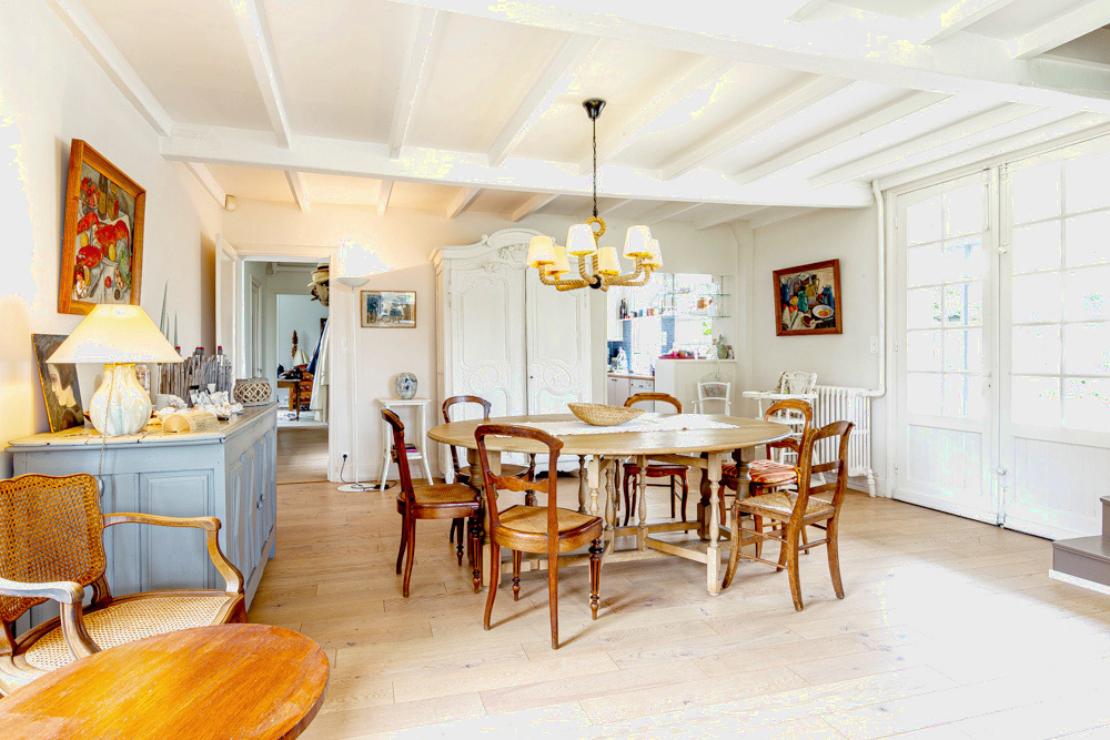 Au rez de chaussée un spacieux salon et salle à manger de 50m2 environ avec cheminée picarde et double exposition, sol en parquet chêne récent, une jolie cuisine équipée de 11m2 sol tomettes, cellier, laverie, dégagement desservant une chambre de 13m2 avec placard, salle de bains et wc, bureau (possibilité chambre 19 m2 environ).