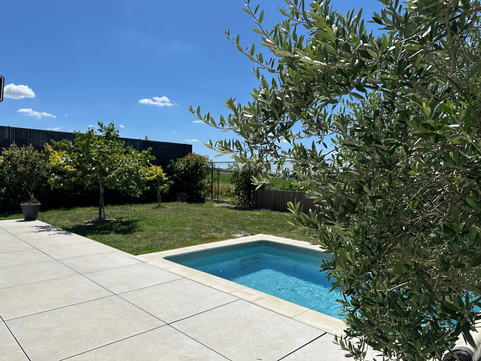 L’ensemble s’ouvre par de grandes baies à galandage sur une terrasse carrelée orientée Sud/Ouest avec piscine.